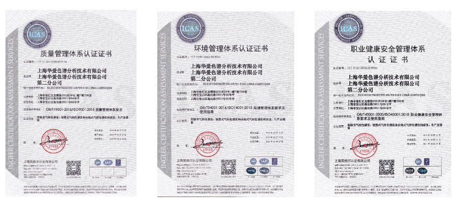 上海华爱色谱近期通过了环境管理体系认证,职业健康安全管理体系认证和质量管理体系认证的更新。